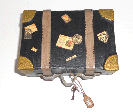 Titeln är utstansad med ritade stygn, lite ”nedsmutsad” m hjälp av en Distressdyna samt täckt med Crackle Paint. Jag har kompletterat med små textrutor. Under texten har jag en chipboardbård som jag målat med ljusblå akrylfärg, färgat in kanterna, fäst en del av en rubonbård på och sedan täckt hela härligheten med Rock Candy! För att få sprickorna att synas ordentligt har jag dragit ett par drag med en Ink Blending Tool som duttats på en Distressdyna i brunt.